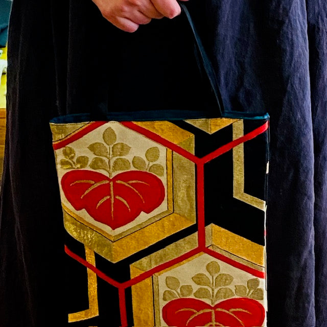 かつて着物として人を引き立てていた艶やかな帯を、今度は日常のバッグとしてお持ちいただけるよう仕立てました。